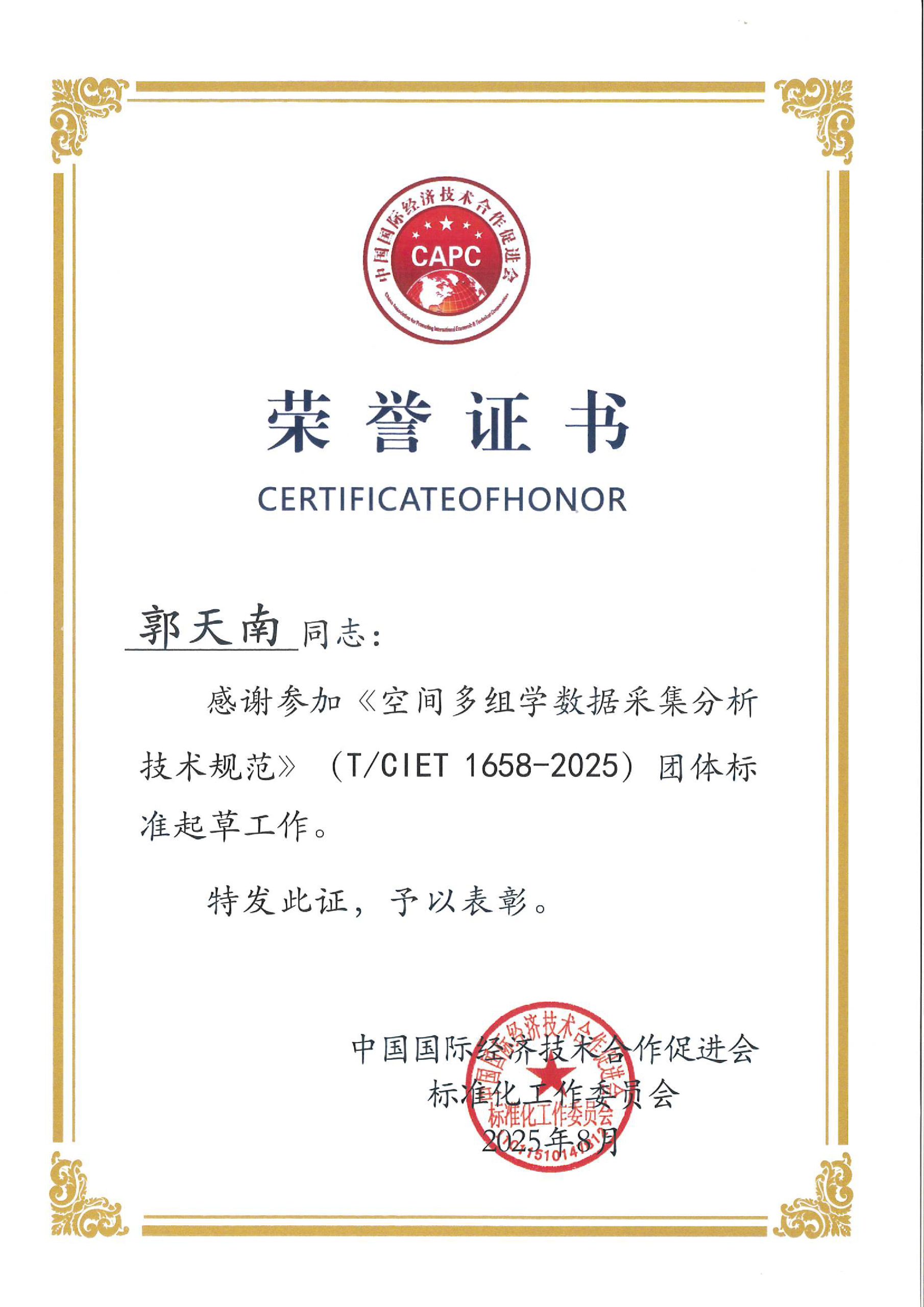 20250831. Dr. Tiannan Guo Contributes to Drafting the Group Standard on Spatial Multi-omics Data (T/CIET 1658-2025).